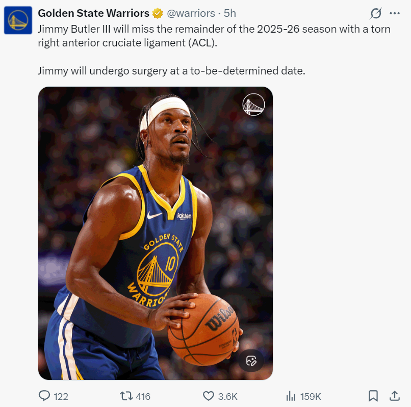 这是勇士背靠背第二场,赛前勇士官方宣布:巴特勒右膝ACL撕裂将缺席25-26赛季剩余比赛,目前巴特勒还没有确定接受手术的时间。根据Shams的说法,巴特勒甚至会缺席26-27赛季初期的一些比赛,勇士本赛季的夺冠窗口期受到巨大影响。